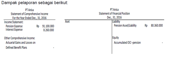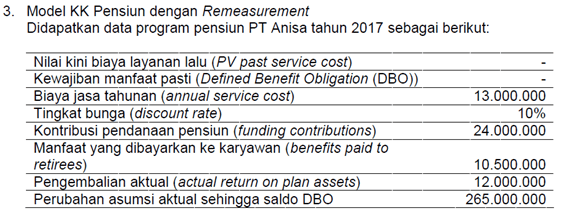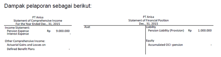 | Didapatkan data program pensiun PT Anisa tahun 2015 sebagai berikut: Aset program (plan assets) | 2 Jan. 2015 | Rp100.000.000 | |