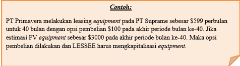 Memberikan opsi kepada LESSEE utk membeli asset leasing pd akhir lease term pd opsi harga (fixed) lebih rendah daripada expected FV .