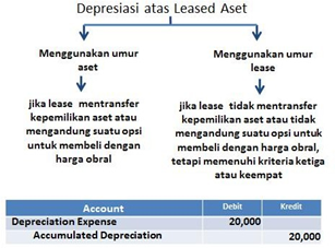 - Jika perjanjian lease mengalihkan kepemilikan aktiva kepada lessee (Kriteria 1) atau mencakup opsi pembelian dengan harga khusus (Kriteria 2) maka aktiva yang di-lease dengan cara yang konsisten melalui kebijakan penyusutan norma lessee atas aktiva yang dimilikinya, dengan menggunakan umur ekonomis aktiva (asset’s economic life)