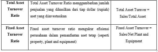 - Asset management efficiency ratios mengukur efektivitas perusahaan dalam pemanfaatan aset yang dimiliki dalam rangka memperoleh penjualan.