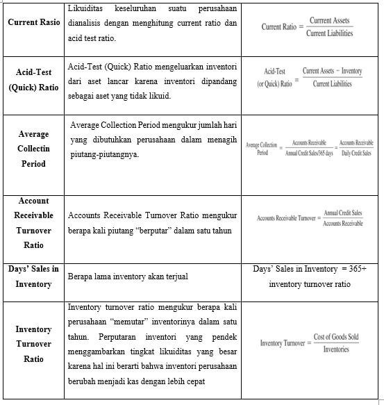 - Likuiditas atas Aset Tertentu – analisis dengan menilai mana saja aset likuid perusahaan (misalnya accounts receivable dan inventories) yang dapat diubah segera menjadi kas.