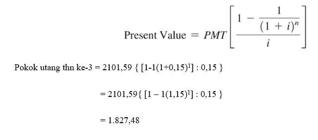 Untuk mencari pokok hutang pada akhir tahun ketiga dapat menggunakan rumus PV dengan n=1 (sisa periode yang belum dibayar)