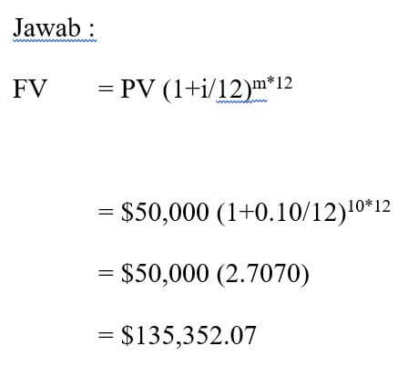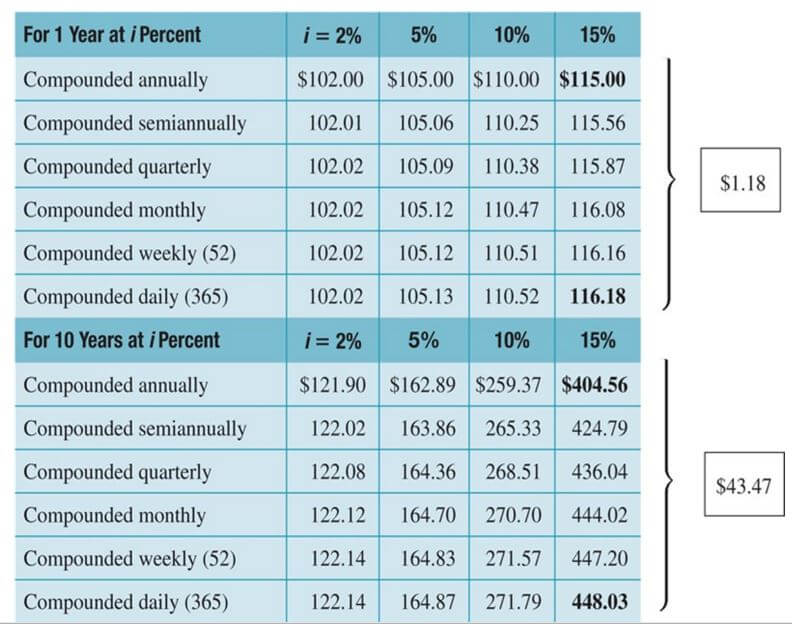 Bank biasanya menawarkan akun tabungan yang memajemukan bunga secara harian, bulanan, atau pertiga bulanan. Semakin sering dimajemukan akan menghasilkan pendapatan bunga yang semakin tinggi dan menjadikan nilai FV-nya juga semakin tinggi.