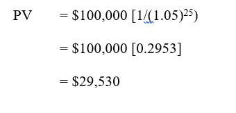 What is the present value of $100,000 to be received at the end of 25 years given a 5% discount rate?