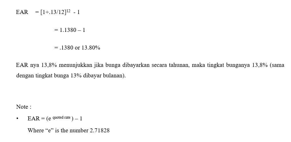 EAR nya 13,8% menunjukkan jika bunga dibayarkan secara tahunan, maka tingkat bunganya 13,8% (sama dengan tingkat bunga 13% dibayar bulanan).