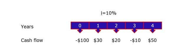 Timeline diatas menunjukkan arus kas keluar sebesar $100 terjadi di tahun pertama, kemudian arus kas masuk sebesar $30 dan $20 di tahun kedua dan ketiga, cash outflow $10, cash inflow $50
