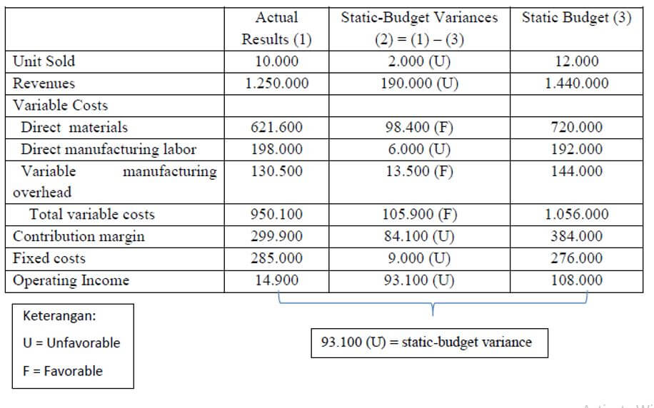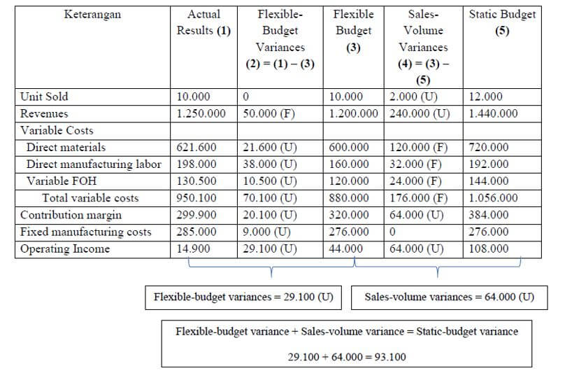 Static-budget variance merupakan perbedaan antara hasil actual (actual results) dengan jumlah yang dianggarankan dalam static budget. Jika analisis hanya sampai disini, maka kita tidak akan banyak memiliki informasi untuk menyelidiki kenapa terjadi selisih sebesar 93.100 dan bersifat unfovarable. Maka, jika mau membandingkan agar lebih fair, maka kita harus gunakan quantity producednya juga 10.000 dalam perhitungannya. Maka dibutuhkan yang namanya Flexible Budget