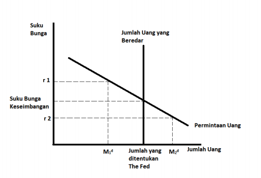 Menurut teori preferensi likuiditas, suku bunga akan mnyesuaikan diri untuk menyembangkan jumlah uang beredar. Jika suku bunga berada di atas keseimbangan (seperti pada r1) jumlah uang yang ingin dipegang oleh masyarakat (M1d) lebih sedikit daripada yang diciptakan oleh The Fed, dan kelebihan uang ini menurunkan suku bunga. Sebaliknya, jika suku bunga berada di bawah keseimbangan seperti pada r2, jumlah uang yang ingin dipegang oleh masyarakat (M2d) lebih besar dari pada jumlah yang telah diciptakan oleh The Fed, sehingga kekurangan uang ini akan menaikkan suku bunga. Oleh karena itu, kekuata penawaran dan permintaan uang dalam pasar uang akan mendorong suku bunga kea rah tingkat keseimbangannya, yang membuat masyarakat cukup dengan jumlah yang mereka pegang sekarang, yaitu sejumlah yang telah The Fed ciptakan.