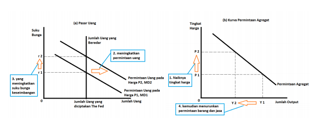 Naiknya tingkat harga dari P1 ke P2 menggeser kurva permintaan uang ke kanan, seperti pada panel (a). Peningkatan jumlah permintaan uag ini menyebabkan suku bunga naik dari r1 ke r2. Karena suku bunga ini adalah biaya peminjaman maka peniingkatnnya mengurangi jumlah permintaan barang dan jasa dari Y1 ke Y2. Hubungan negative antara harga dan jumlah permintaan diwakili oleh kurva permintaan agregat yang miring ke bawah seperti pada panel (b).