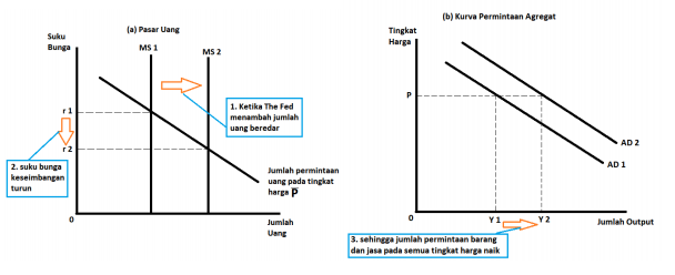 Pada panel (a) meningkatnya jumlah uang beredar dari MS1 ke MS2, menurunkan suku bunga keseimbangan dari r1 ke r2. Karena suku bunga ini adalah biaya peminjaman maka turunnya suku bunga meningkatkan permintaan barang dan jasa pada semua tingkat harga dari Y1 ke Y2. Oleh karena itu kurva permintaan agregat pada panel (b) bergeser dari AD1 ke AD2.