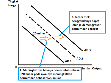 Meningkatnya pembelanjaan pemerintah sebsesar $20 miliardapat menggeser ke kanan permintaan agregat dengan nilai yang lebih besar dari pada $20 miliar. Efek penggandaan muncul karena peningkatan pendapatan agregat akan mendorong pembelanjaan yang lebih oleh konsumen.