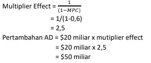 Jika diketahui pemerintah menambah pengeluaran sebesar $20 miliar, sedangkan MPC adalah 0,6. Berapakah pertambahan permintaan agregatnya?
