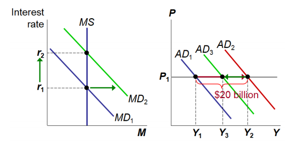 Panel (a) memperlihatkan situasi di pasar uang. Ketika pemerintah meningkatkan pembelanjaan berbagai barang dan jasa kenaikan pendapatan yang diakibatkannya juga menaikkan permintaan uang dari MD1 ke MD2, dan hal ini menyebabkan suku bunga naik dari r1 ke r2. Sementara itu panel (b) menunjukkan dampaknyaterhadap permintaan agregat dari AD1 ke AD2. Kerana suku bunga adalah biaya peminjaman maka kenaikkan suku bunga akan mengurangi permintaan barang dan jasa, terutama barang-barang modal atau investasi. Pembatasan paksa pada investasi ini akan mengimpaskan sebagian dampak ekspansi fiskal terhadap permintaan agregat. Pada akhirnya kurva permintaan agregat hanya bergeser ke AD3.